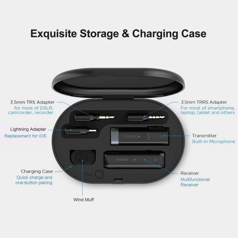 Với một hộp đựng tinh tế để sạc và ghép nối máy phát và máy thu. Được tích hợp pin dung lượng lớn, thời gian làm việc của bộ phát / bộ thu lên đến 4,5 giờ / 8 giờ.