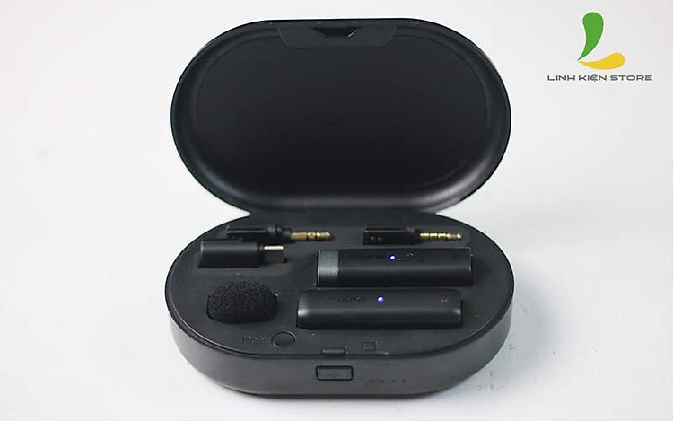 Hộp đựng hỗ trợ sạc nhanh không dây chứa dung lượng lên đến 1000mAh. Hỗ trợ người dùng sạc trực tiếp cho cả máy phát và thu chỉ trong vòng 2 giờ mà không cần nguồn điện. Transmitter hoạt động 8 giờ và Receiver hoạt động 4.5 giờ cho mỗi lần sạc đầy. Đèn báo Led trên cả hai thiết bị hiển thị nhiều chế độ: thông báo, tắt tiếng và mức pin yếu.