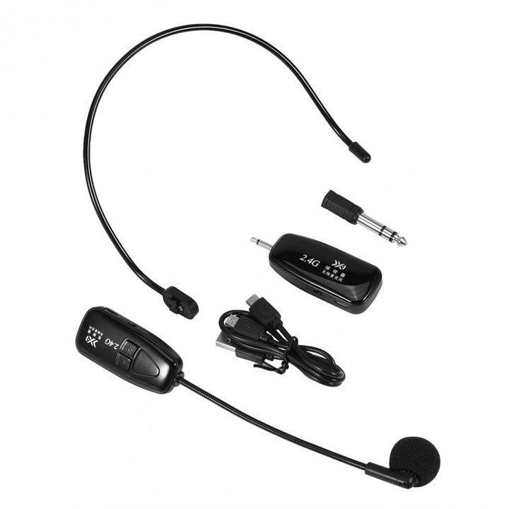 – Bộ sản phẩm gồm: 1 thanh micro, 1 thanh đeo, 1 mút lọc micro, 1 cục cắm 2.4GHz, 1 thiết bị chuyển đổi 3.5mm sang 6.5mm, 1 cáp sạc 2 đầu và 1 hướng dẫn sử dụng