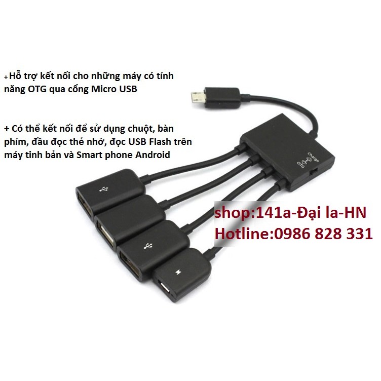 MICRO USB HUB OTG 4 IN 1 KẾT NỐI ĐIỆN THOẠI, MÁY TÍNH BẢNGMicro USB HUB OTG 4 trong 1 hỗ trợ kết nối cho những máy có tính năng OTG qua cổng Micro USB, nhằm để sử dụng chuột, bàn phím, đầu đọc thẻ nhớ, đọc USB Flash trên máy tính bảng và smartphone Android. Micro USB HUB OTG 4 trong 1 gồm một cổng MicroUSB cái và ba cổng USB cái với chiều dài tổng cộng là 20cm, vừa phải và tiện dụng.