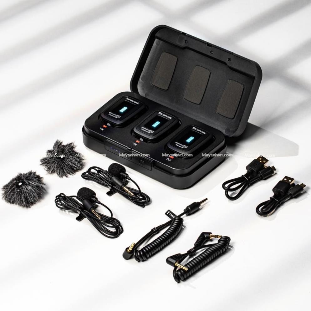 Bộ sản phẩm bao gồm: 1 bộ phát, 2 bộ nhận, 2 micro lavalier, hộp sạc