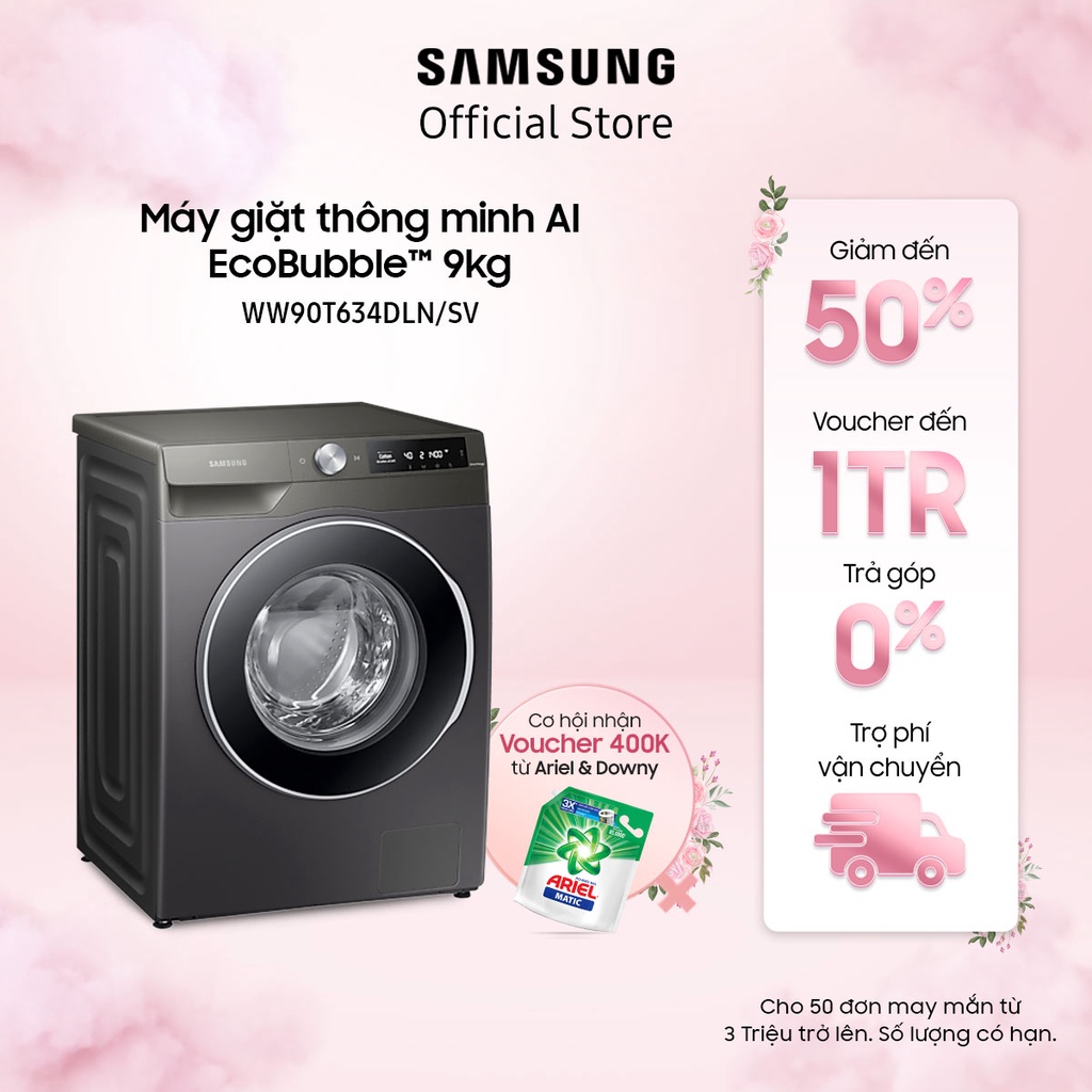 Thiết Bị Điện Gia Dụng > Thiết bị điện gia dụng lớn > Máy giặt & Máy sấy > Máy giặt || [Mã ELSS500 giảm 10% đơn 500K] Miễn phí công lắp đặt_Máy giặt Samsung AI Inverter 9Kg WW90T634DLN/SVCòn hàng