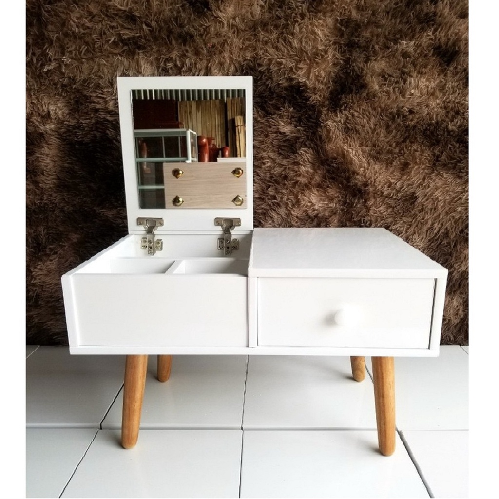 - Bàn trang điểm mini thông minh thiết kế gương gập là loại bàn phấn đa năng, khi không cần trang điểm, gương có thể úp xuống tạo thành một chiếc bàn liền khối về mặt phẳng để làm việc vô cùng tiện lợi. Mặt trên bạn có thể làm việc còn phần dưới là những khoảng trống giúp bạn cất chứa các phụ kiện trang điểm hoặc những cuốn sách yêu thích của bạn.
