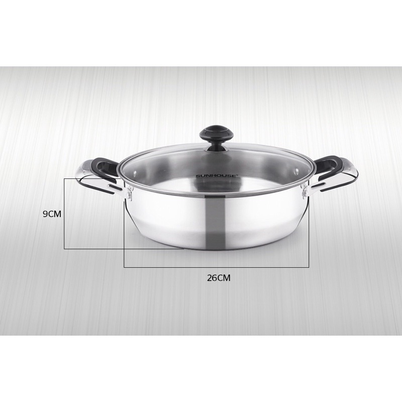 Nồi lẩu inox 1 đáy SUNHOUSE SHL26 được làm bằng chất liệu inox cao cấp, không bị oxy hóa, kiểu dáng đẹp mắt, vung kính trong suốt, quai núm bằng nhựa cách nhiệt. Sản phẩm dùng được được trên mọi loại bếp và đáp ứng tốt nhu cầu sử dụng tại gia đình.