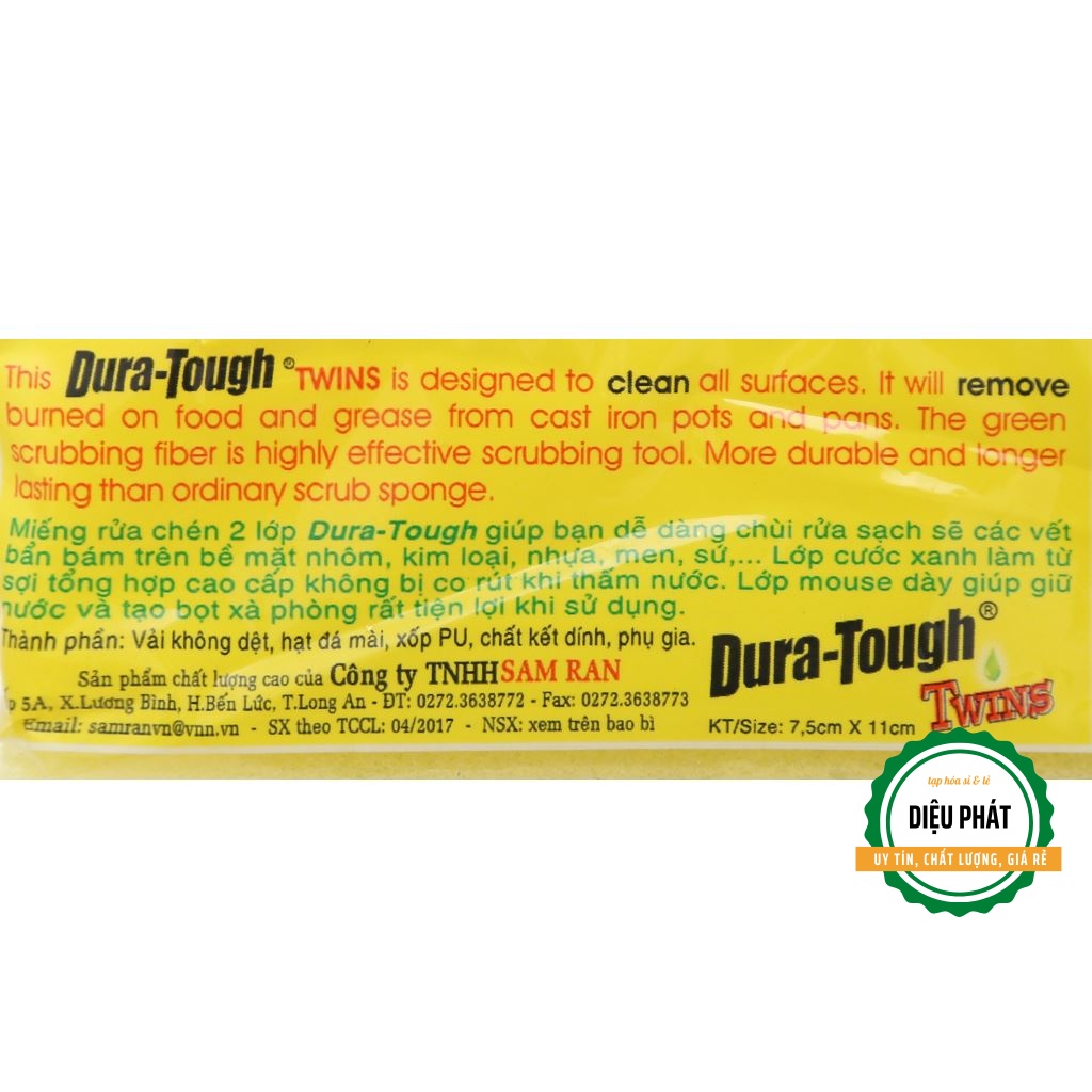 Miếng Bọt Biển, Miếng Rửa Chén Bát 2 Lớp Samran Dura-Tough 11cm lớp gồm Mặt cước với các hạt mài li ti đánh rửa hiệu quả, làm sạch nhanh các vệt thức ăn dính cháy. Mặt xốp tạo bọt tốt, dùng an toàn trên bề mặt nồi chảo chống dính, ly chén thủy tinh, sứ...