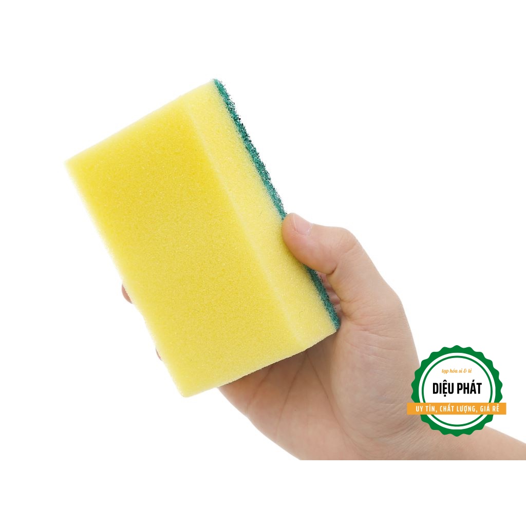 - Nổi bật: Mặt cước với các hạt mài li ti đánh rửa hiệu quả, làm sạch nhanh các vệt thức ăn dính cháy. Mặt xốp tạo bọt tốt, dùng an toàn trên bề mặt nồi chảo chống dính, ly chén thủy tinh, sứ...