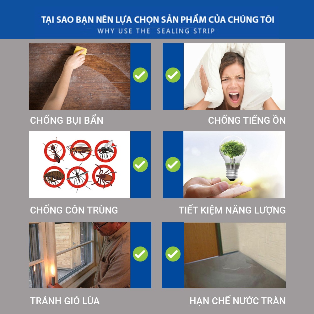 Nẹp Cao Su CHẶN CỬA CHỐNG CÔN TRÙNG thường được sử dụng ở các cửa chính, cửa phòng ngủ. Ưu điểm của thanh dán CHẮN CỬA là ngăn bụi, chống ồn, cách âm, ngăn lỗ hổng thoát nhiệt khi sử dụng điều hòa, ngăn côn trùng vào nhà. Đối với các nhà mặt đường, nếu khe hở bên dưới cánh cửa phòng khách lớn, sử dụng gioăng chắc chắn sẽ hạn chế bụi bẩn và âm thanh còi xe ở bên phía ngoài đường.