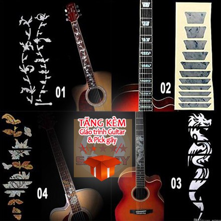 Miếng dán khảm cần đàn, chất liệu sticker cao cấp có nhiều loại để khách hàng lựa chọn mẫu Rồng, hoa lá, hoa sen, chữ thập, hình thang…Giá JUSD
