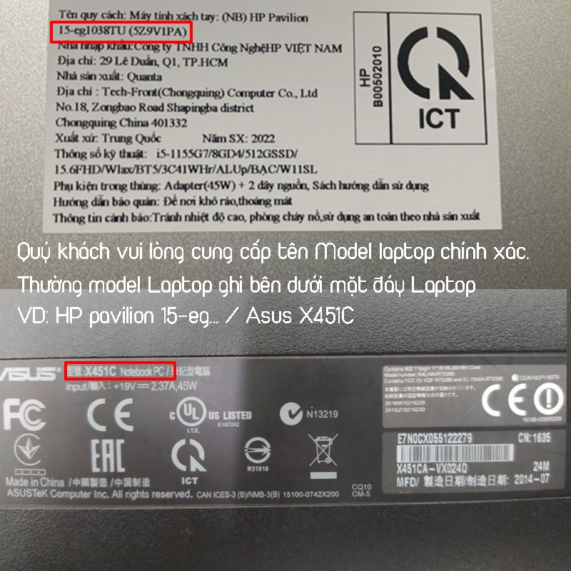 - Mặt đáy laptop sẽ có 1 tem màu trắng (hoặc đen) ghi thông tin máy. bạn tìm dòng có chữ model , sau chữ model chính là mã máy vd: asus A515 , acer nitro5 a515 , dell xps 9370 ......