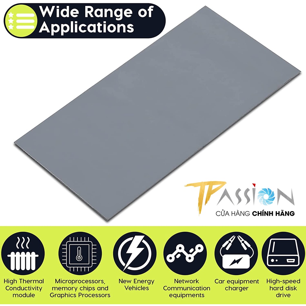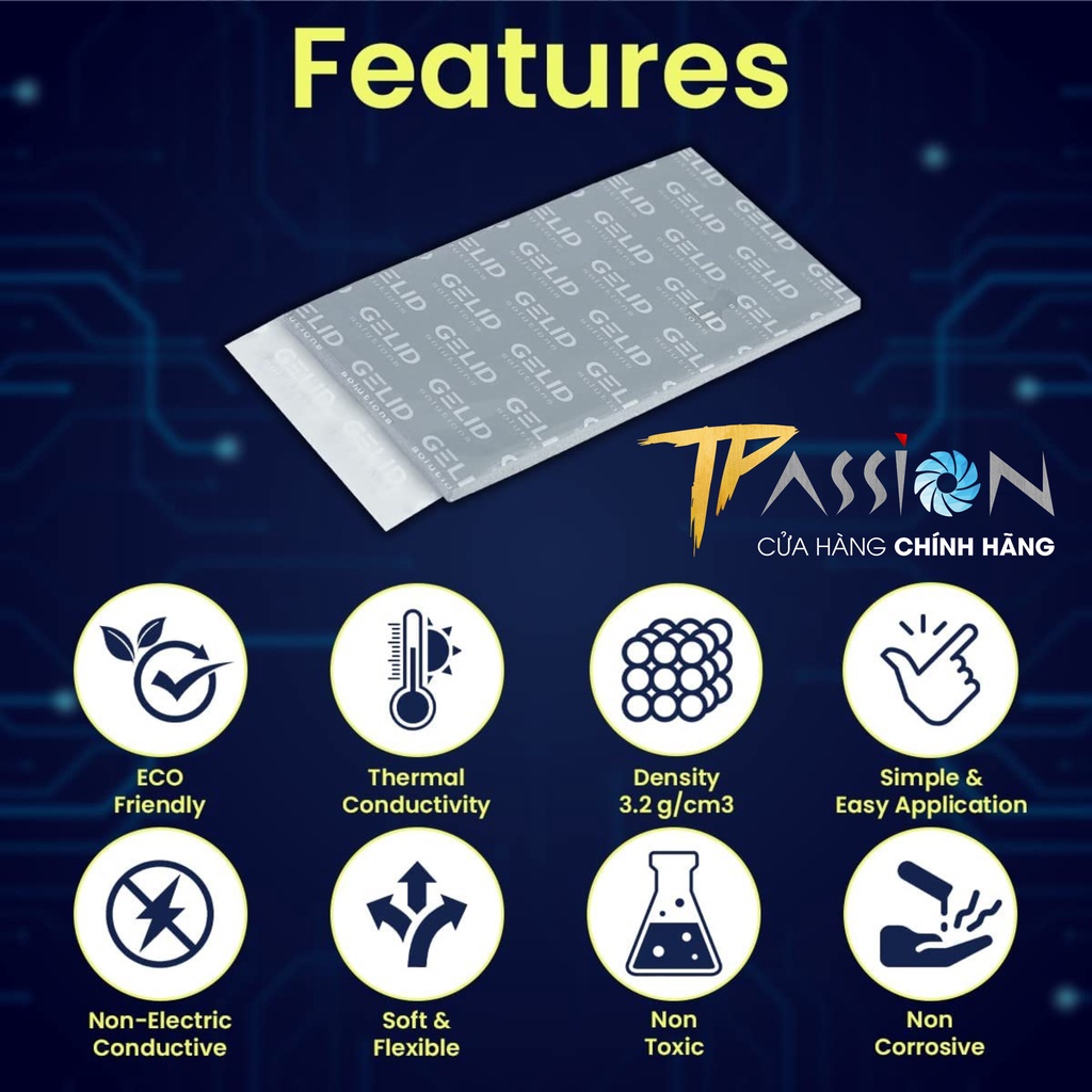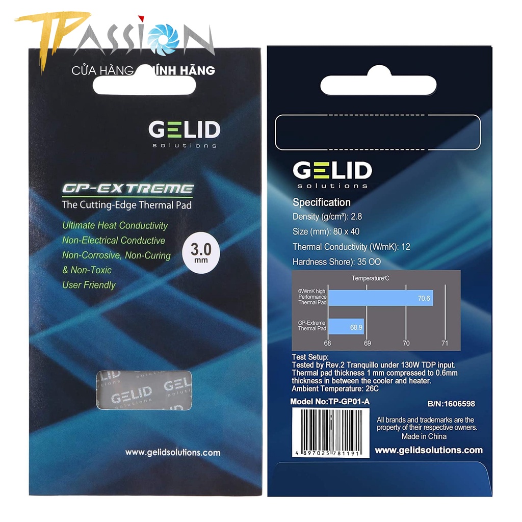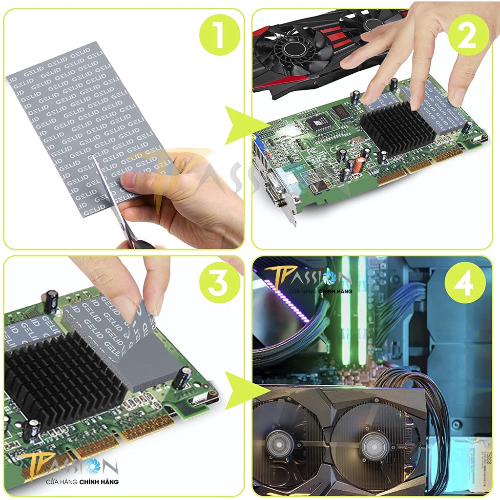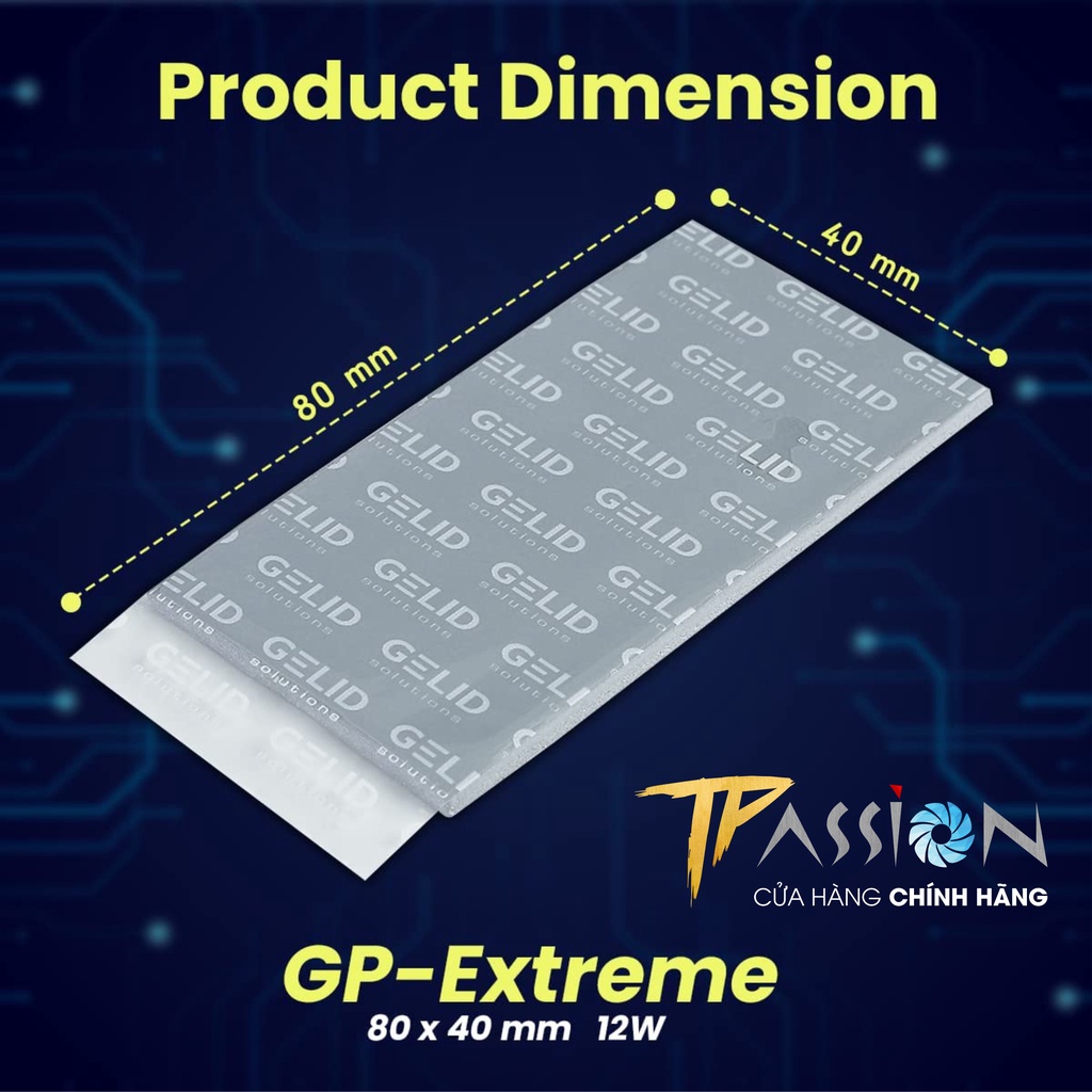 TPASSION CAM KẾT HÀNG CHÍNH HÃNG, MỚI 100%, FULLBOXGelid Thermal Pad GP-Extreme được thiết kế để cung cấp khả năng tiếp xúc nhiệt hoàn hảo với bộ tản nhiệt khi được lắp đặt trên các bảng mạch có chênh lệch độ cao và bề mặt không bằng phẳng như bộ vi điều khiển, IC nhớ, IC tương tự, MOSFET và các thành phần SMD khác. Nhờ sự mềm mại và khả năng dẫn nhiệt tối ưu, GP-Extreme lấp đầy không gian thích hợp và mang lại hiệu suất tốt nhất trong phân khúc. GP-Extreme không dẫn điện, không ăn mòn, không đóng rắn và không độc hại. GP-Extreme đảm bảo ứng dụng dễ dàng và kích thước tấm tản nhiệt 80×40 mm, 120x120 mm vừa vặn tối ưu với các bề mặt PCB lớn của card VGA, máy tính xách tay, máy chơi game và các thiết bị khác.