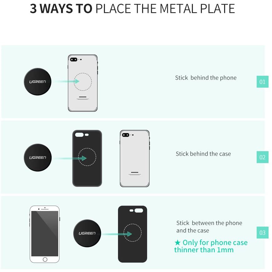 Với độ dày 0,5 mm, các tấm kim loại mỏng UGREEN để gắn điện thoại từ tính có thể dễ dàng gắn vào iphone của bạn. Bề mặt nhẵn không có cạnh sắc sẽ không làm hỏng ngón tay hoặc điện thoại thông minh của bạn