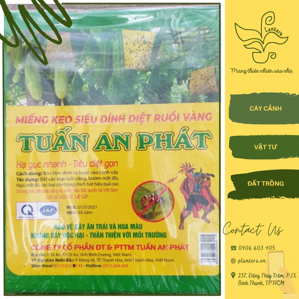 Cách dùng: Bóc tấm dính ra buộc vào cành cây.Tác dụng: Là loại miếng dính dùng để dẫn dụ và tiêu diệt ruồi vàng và các loại côn trùng( bướm mắt đỏ, ngài mắt đỏ, các côn trùng ) hay trích hút vào tất cả các loại trái cây : cam, bưởi, táo, xoài, ( cây ăn trái vvv.) Dưa leo. Bầu, bí, mướp, khổ qua ( cây rau màu..vvv…).
