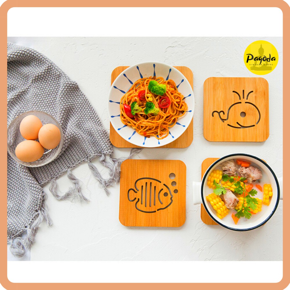Với kích thước vuông, gọn, được khắc các họa tiết ngộ nghĩnh đẹp mắt, đế lót nồi bằng gỗ cũng là 1 vật dụng trang trí giúp cho bàn ăn của gia đình bạn thêm sinh động và lạ mắt.