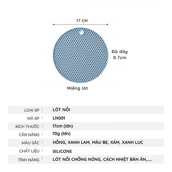 - DỄ DÀNG VỆ SINH VÀ PHƠI KHÔ CẤT GỌN: Chất liệu silicone không thấm nước giúp việc rửa vết bẩn, vết dầu mỡ trên miếng lót nồi thật dễ dàng, đặc biệt miếng lót nồi có lỗ treo giúp cho việc phơi ráo và cất gọn.