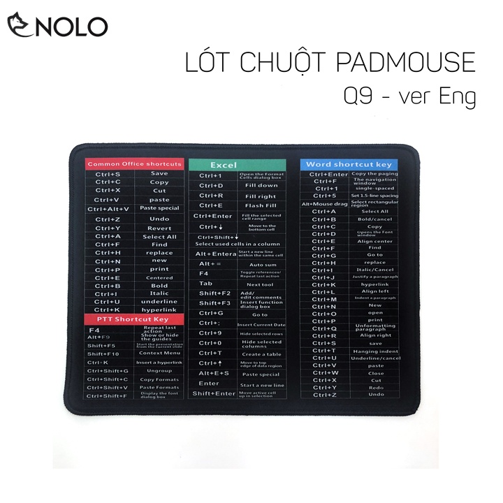 Lót Chuột Padmouse Q9 Eng Ver Với 79 Phím Tắt Kích Thước 32x24cm Dày 3 Ly Bề Mặt In 3D Không Phai Lệnh Của Office, PPT, Excel, WordGiới thiệu: