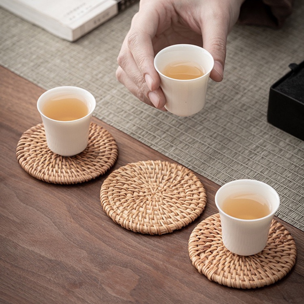 Miếng lót ly cốc lót bàn ăn chất liệu mây tre đan trang trí nhà cửa, phụ kiện decor chụp ảnh