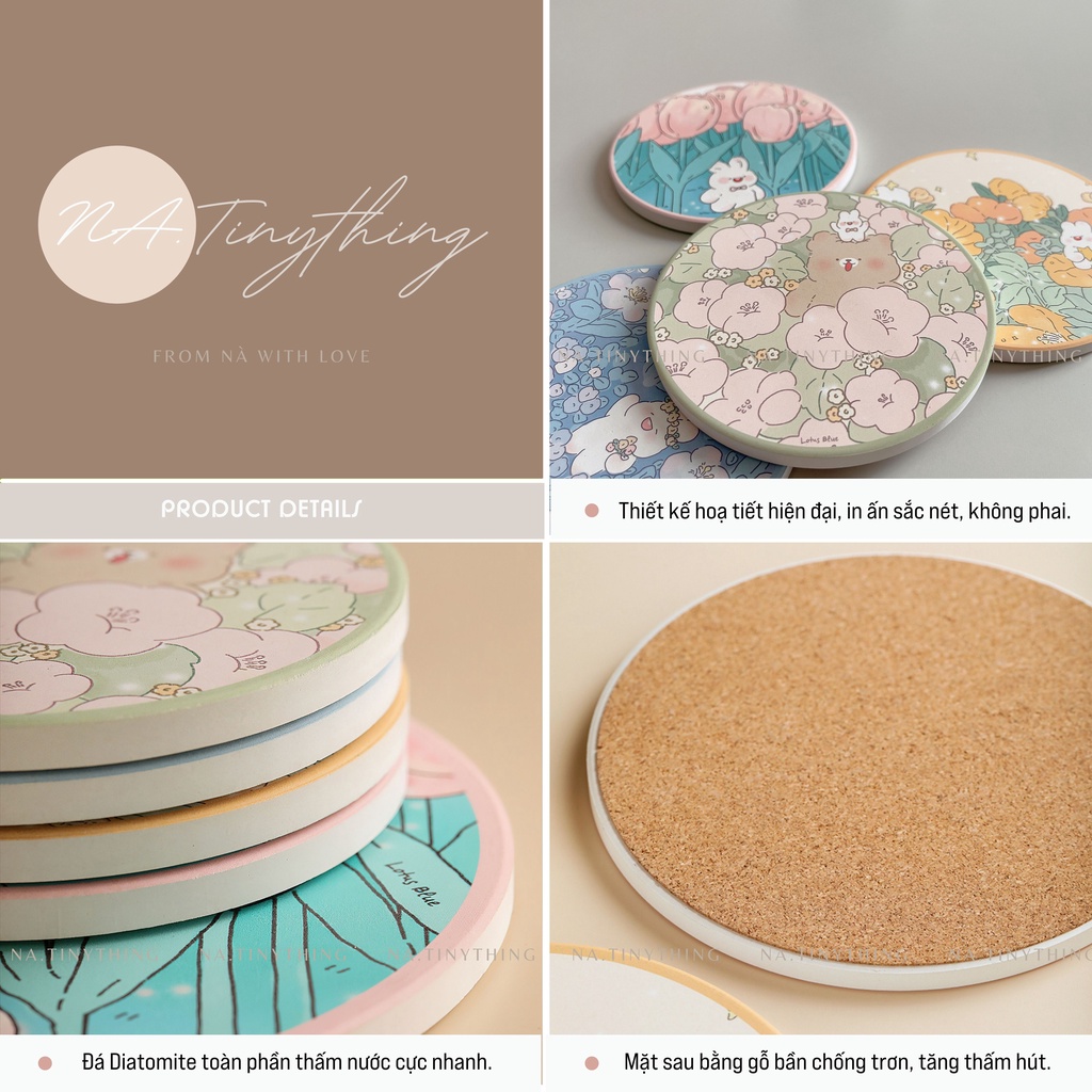 Miếng lót ly, đế lót cốc làm bằng đá thấm hút nước hoạ tiết hoạt hình dễ thương phong cách Hàn Quốc NA0063👑👑👑 Đây là hàng loại 1, sử dụng Đá diatomite kết hợp gỗ bần nhằm tăng khả năng siêu thấm hút tức thì. Hoạ tiết được in trên dây chuyền máy móc hiện đại đảm bảo sắc nét, không như những loại giá rẻ khác pha thạch cao trên thị trường.