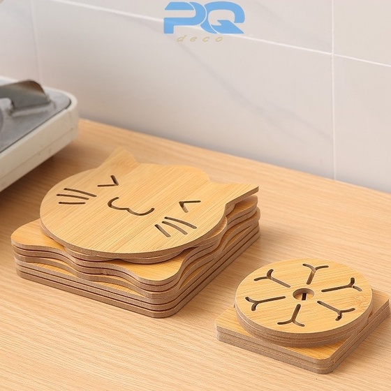 - Miếng lót nồi bằng gỗ những miếng lót nồi làm bằng vật liệu gỗ, chủ yếu là loại gỗ xà cừ, cứng dày, tương đương chiếc thớt nhỏ, không có độ đàn hồi, cách nhiệt tốt, được xử lý chống mối mọt, cong vênh, được thiết kế nhiều kiểu dáng độc đáo như hình mặt mèo, hình xương cá, hình hoa…Đa số loại miếng lót này chỉ có màu gỗ, không có màu sắc khác và vì có độ cứng cao nên nếu đặt miếng lót mạnh tay hoặc cọ xát nhiều, miếng lót có thể làm trầy xước mặt bàn, kệ bếp.