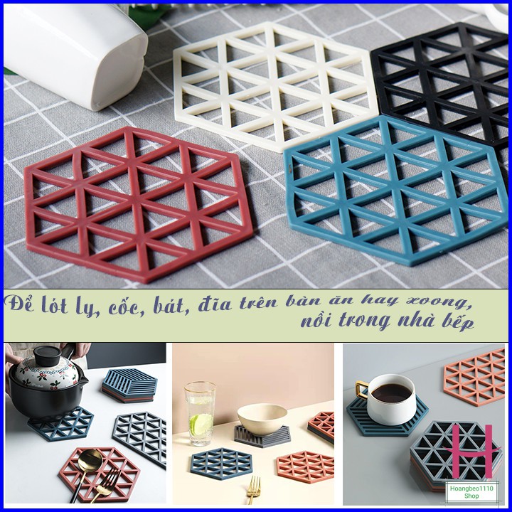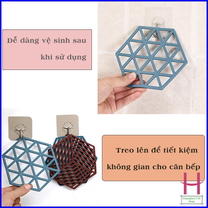 - Miếng lót nồi lục giác được làm từ vật liệu cao su nhiệt dẻo cùng những đặc tính cực kì vượt trội, chịu nhiệt độ tốt, dễ dàng đáp ứng với những vật dụng khác trong nhà bếp của người dùng. - Miếng lót dùng để lót ly, cốc, bát, đĩa trên bàn ăn hay xoong, nồi trong nhà bếp. Tạo hình lục giác cực kì ấn tượng và bắt mắt với gam màu pantone cực kì nổi bật