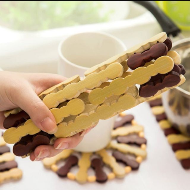 - Miếng lót xinh xắn góp phần làm đẹp không gian bếp, bàn ăn. Được gia công hoàn toàn bằng chất liệu gỗ tre, gọn nhẹ, nhưng cứng cáp tuyệt đối.