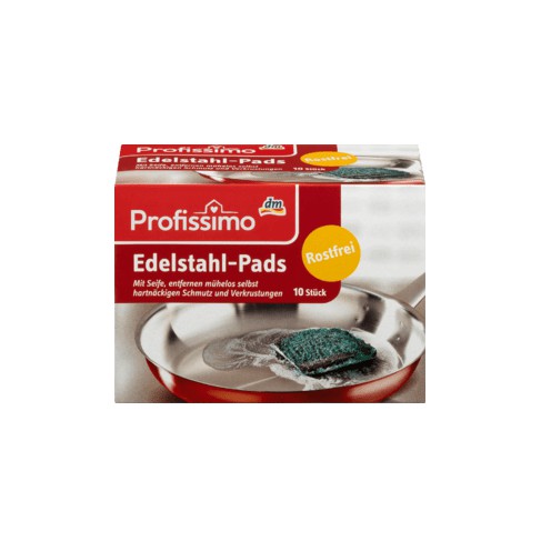 Miếng rửa bát, cọ xoong nồi và làm sạch các vật liệu cứng như kim loại, gốm sứ, kính, lò sưởi, lò nướng.... có tẩm sẵn xả phòng của hãng Profissimo-> Sản phẩm có 1 lớp là thép không gỉ và lớp vải mềm bên trong tẩm xà bông sẵn, chỉ cần nhúng vào nước là có thể rửa, lau hoặc kỳ cọ các sản phẩm mình cần làm sạch.