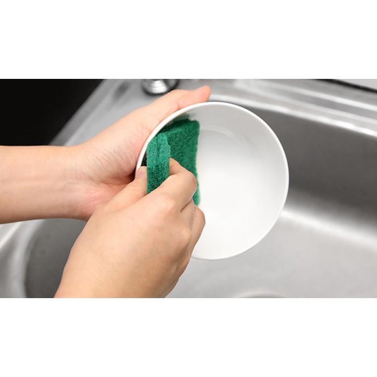 - Miếng rửa bát dễ dàng, nhanh chóng lấy đi những vết bẩn cứng đầu (vết cháy khét, vết dính thức ăn, vết ố…) bám dính trên chảo, nồi, bát, chén, đĩa... mà không cần nhiều nước rửa chén nhờ khả năng thấm hút, tạo và giữ bọt tốt.