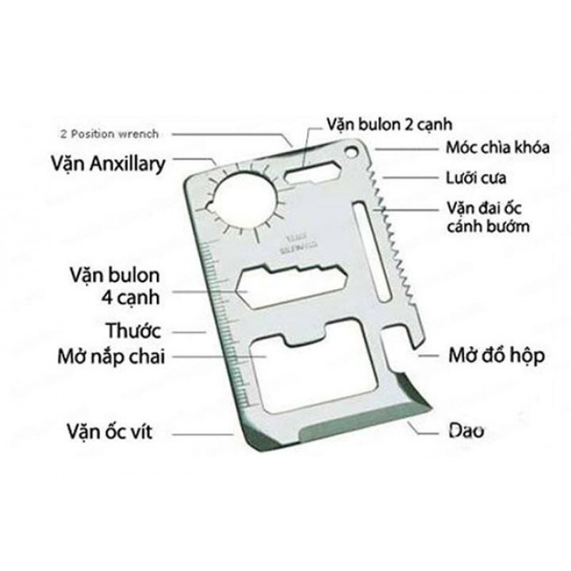 - 11 công dụng khác nhau: khui các loại đồ hộp, dao, vặn ốc vít, thước kẻ, khui nắp chai, vặn bulon 4 cạnh, vặn đai ốc cánh bướm, lưỡi cưa, vặn anxillary, vặn bulon 2 cạnh, móc chìa khóa