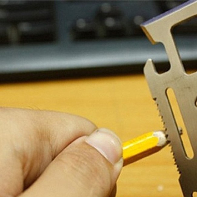 - Miếng thép đa năng có thiết kế nhỏ gọn tương tự một chiếc thẻ ATM, nhưng chứa đến 11 công dụng tuyệt vời khác nhau.- Có 11 công dụng: khui các loại đồ hộp, dao, vặn ốc vít, thước kẻ, khui nắp chai, vặn bulon 4 cạnh, vặn đai ốc cánh bướm, lưỡi cưa, vặn Anxillary, vặn bulon 2 cạnh, móc chìa khóa.