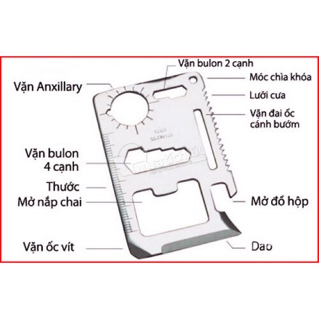 - Miếng thép đa năng có thể dùng khui đồ hộp, làm dao, ốc vít bulon 4 cạnh, làm móc chìa khóa...