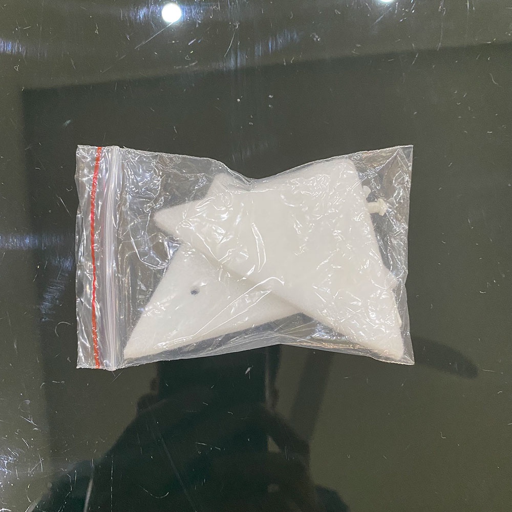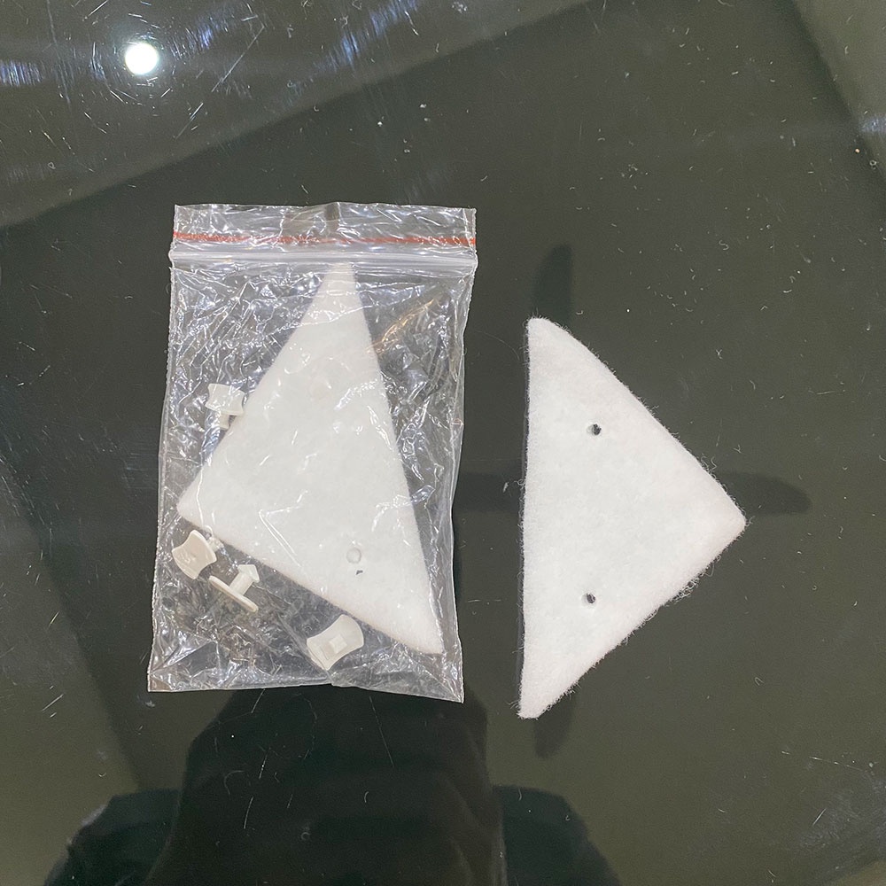 Sản phẩm bao gồm: 2 miếng bông màu trắng hình tam giác màu trắng + 4 chốt khóa bông lau màu đen