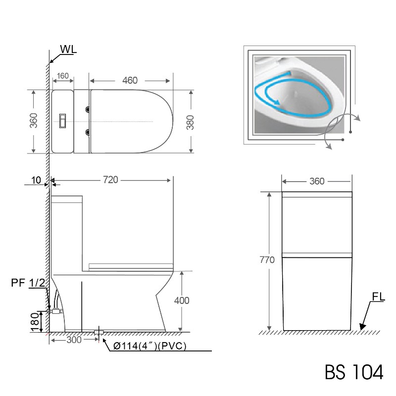 Thông tin Bồn cầu Basics BS 104Kiểu xả: Xả xoáy kiểu Siphonic ngăn mùi hôi một cách hiệu quả.