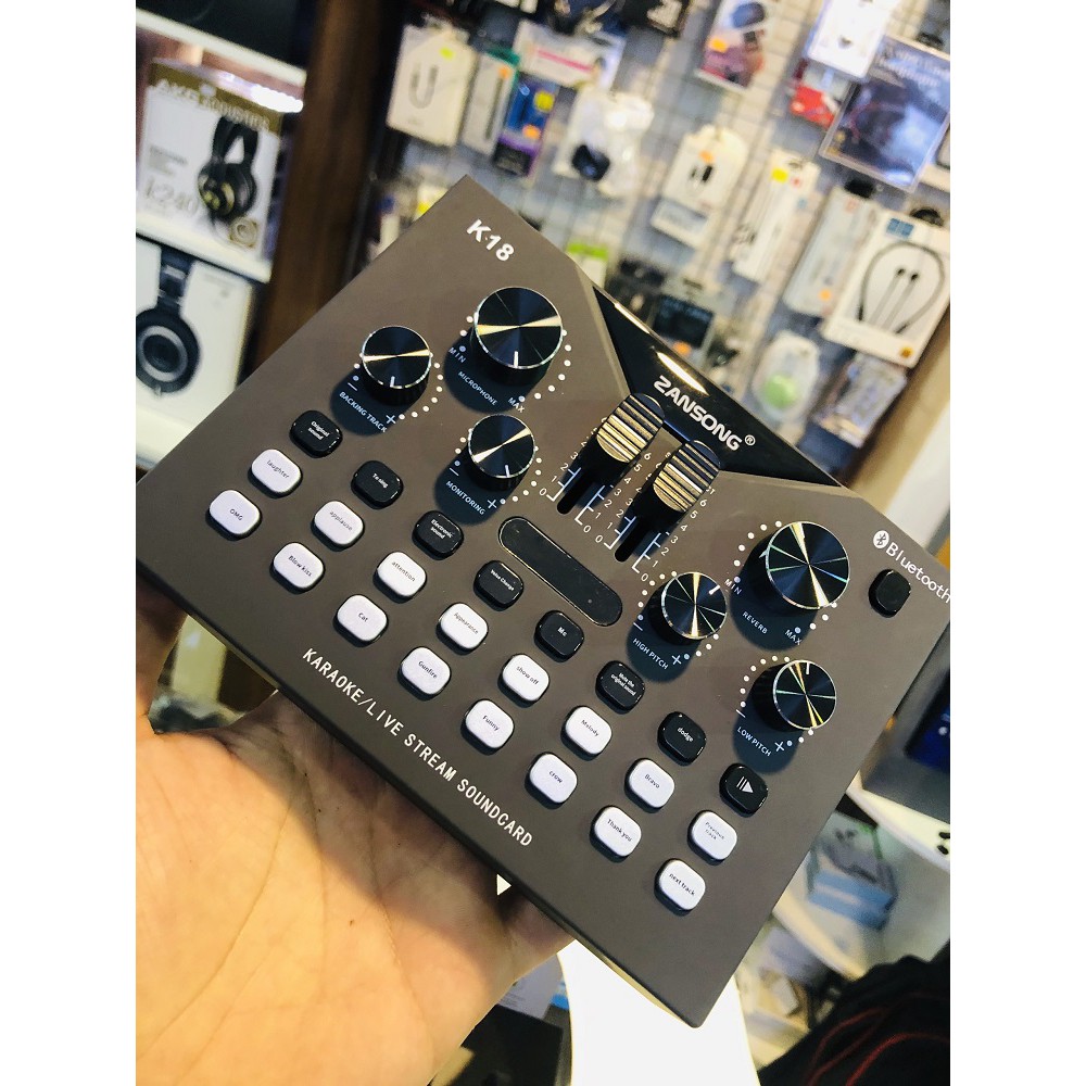- SoundCard Zansong K18 (Kèm 2 micro không dây) Mang tới 2 cổng live để livestream nhanh chóng : Live 1 và live 2 dễ dàng livestream trên mạng xã hội
