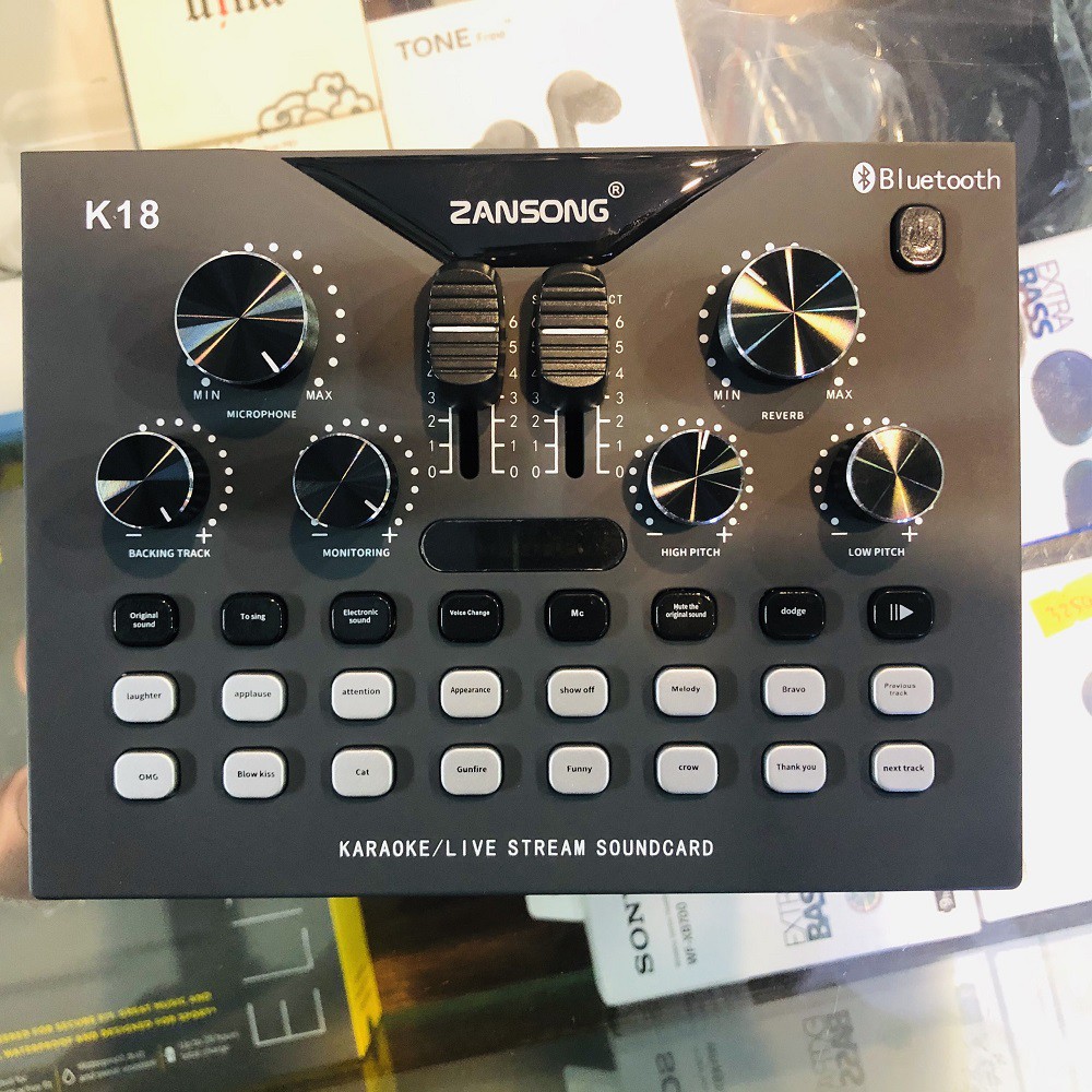 SoundCard Zansong K18 (Kèm 2 micro không dây) Tích hợp những nút bấm vật lý để giúp cho người dùng có thể điều khiển những tác vụ âm thanh cực kì nhanh chóng như là: