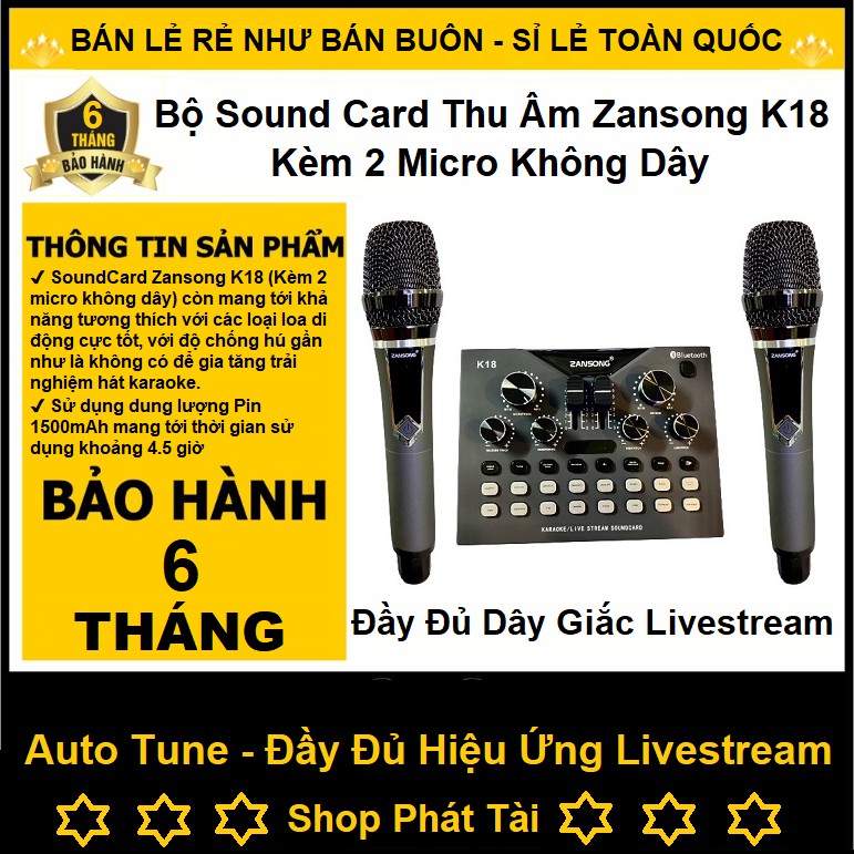 ✔✔✔✔✔✔ SoundCard Zansong K18 (Kèm 2 micro không dây) Hỗ trợ kết nối với 2 micro không dây đi sẵn thông qua sóng UHF để giúp cho khả năng kết nối truyền tải ổn định nhanh nhất và Micro không dây sẽ dùng Pin AA dễ dàng thay thế khi hết Pin