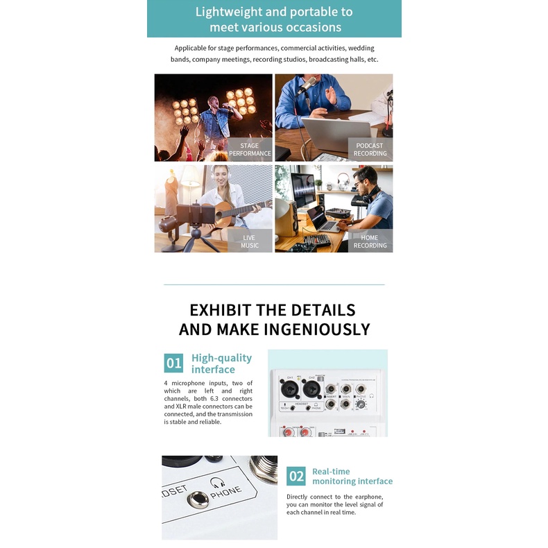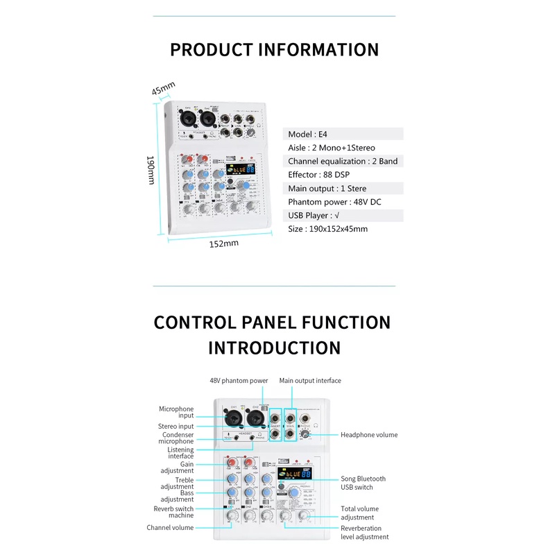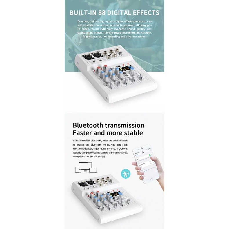Mixer thu âm livestream karaoke E4 2 cổng micro XLR, 2 cổng phantom 48V, 1 cổng 3.5 cho micro 5v mode mới nhất 2021