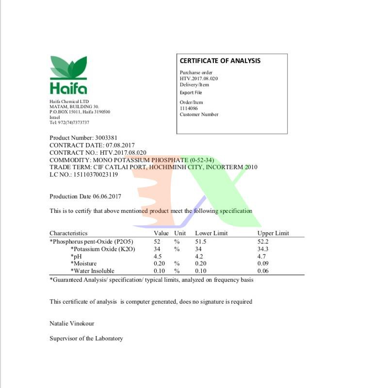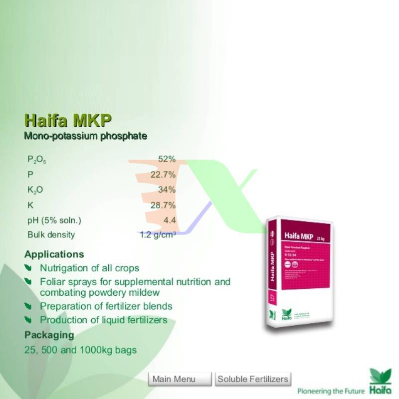 Đây là nguồn cung cấp Lân (Phosphate) và Kali chính trong dinh dưỡng thủy canh, thiếu thành phần này sẽ ảnh hưởng trực tiếp đến lá (khô xám), hoa (còi cọc), quả (bé, hình dạng vẹo vọ)... Đây là sản phẩm của Haifa xuất xứ nhập khẩu Isarel. Phân MPK hay gọi là MKP haifa.
