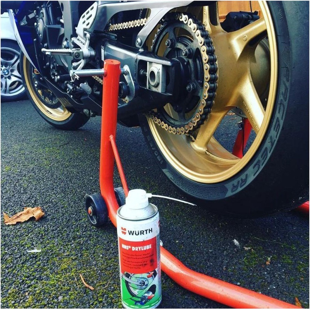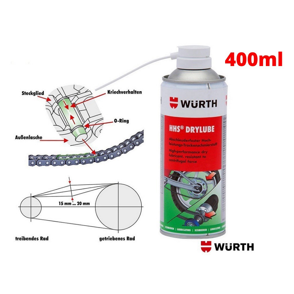 Giới thiệu Mỡ Bò Khô dạng xịt Bôi Trơn Sên Xe, Xích Truyền Động, Khớp Nối, Bản Lề Wurth HHS Drylube chai 400ml Nhập Khẩu Chính Hãng