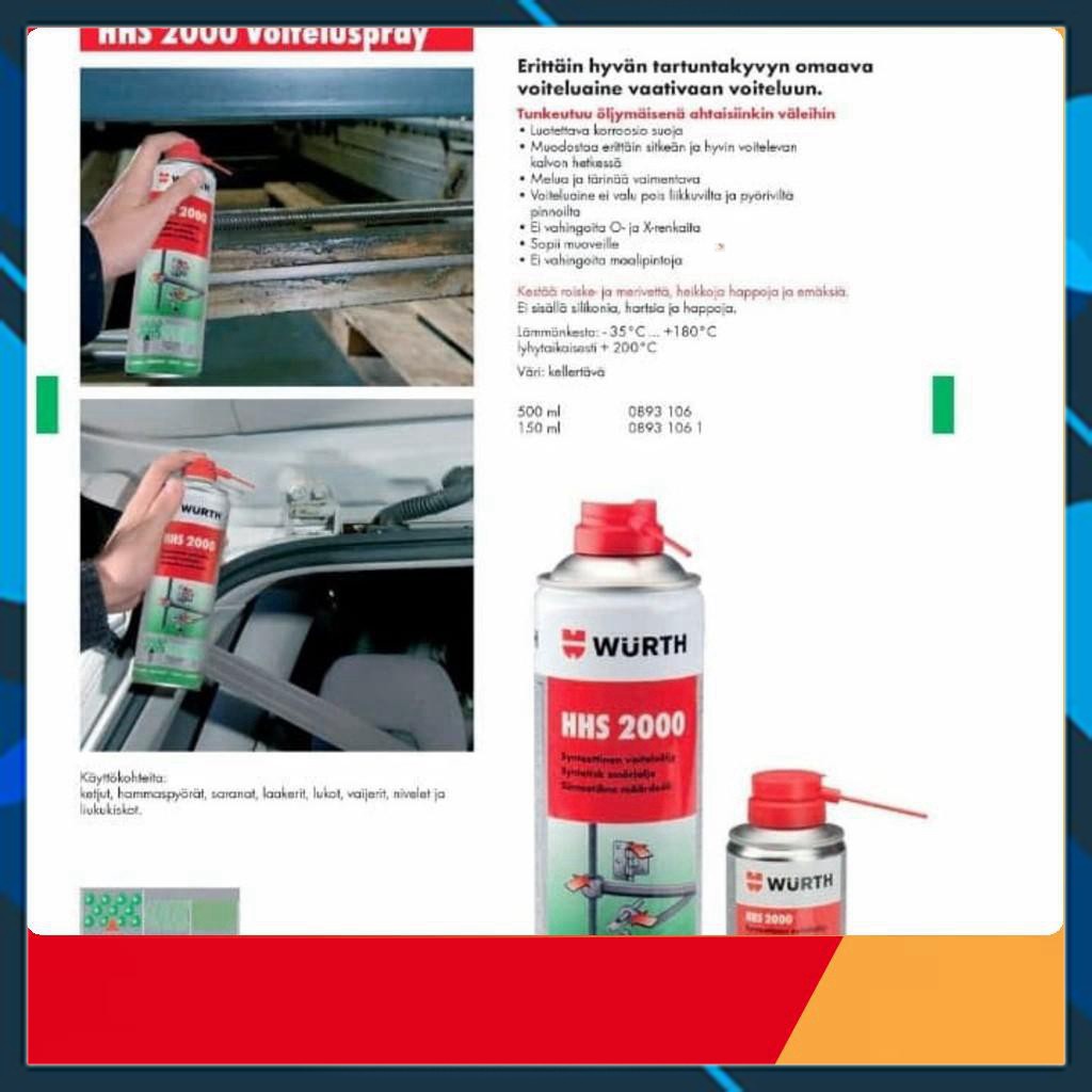 Ô tô > Dầu nhớt và phụ gia ô tô > Mỡ & Chất bôi trơn || Mỡ bò nước dạng xịt bôi trơn chịu nhiệt Wurth HHS 2000 500mlCòn hàng