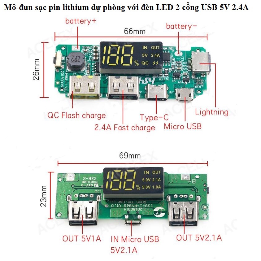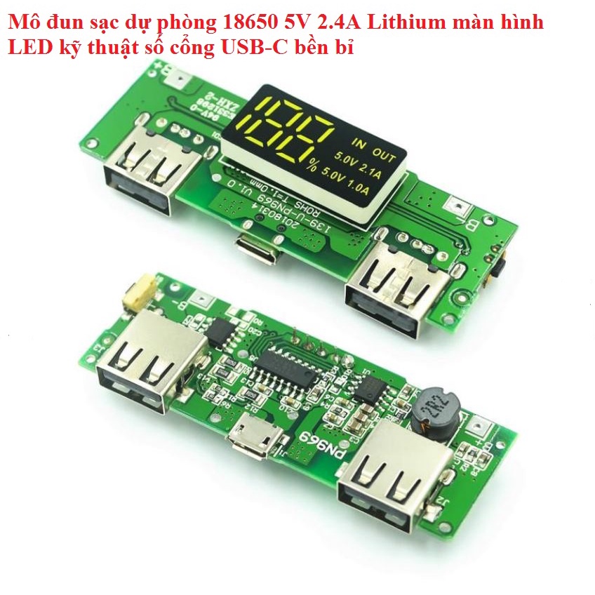 Giới thiệu Mô-đun sạc pin lithium dự phòng với đèn LED 2 cổng USB 5V 2.4A 2A 1A Micro / Type-C