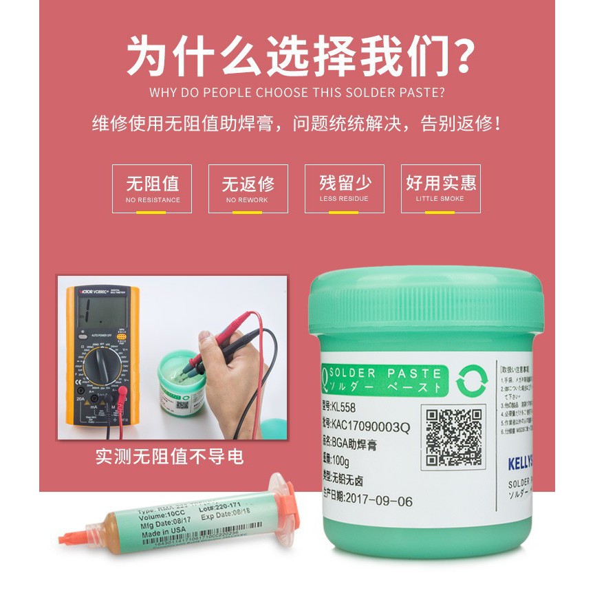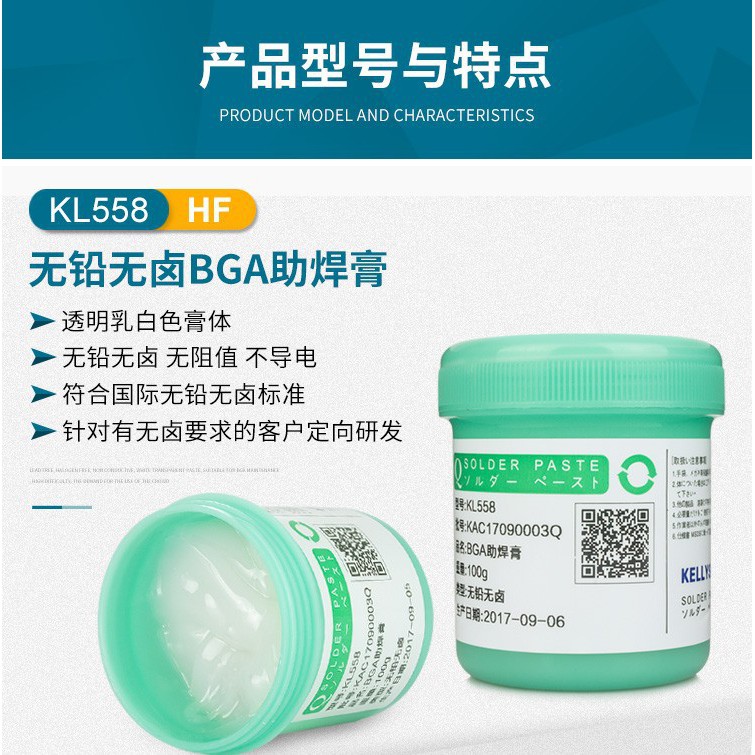 KL558 là loại mỡ hàn chất lượng cao chuyên dùng trong công việc hàn các loại IC và linh kiện điện tử, điện thoại.Là loại mỡ hàn BGA không chì & không halogen thân thiện với môi trường