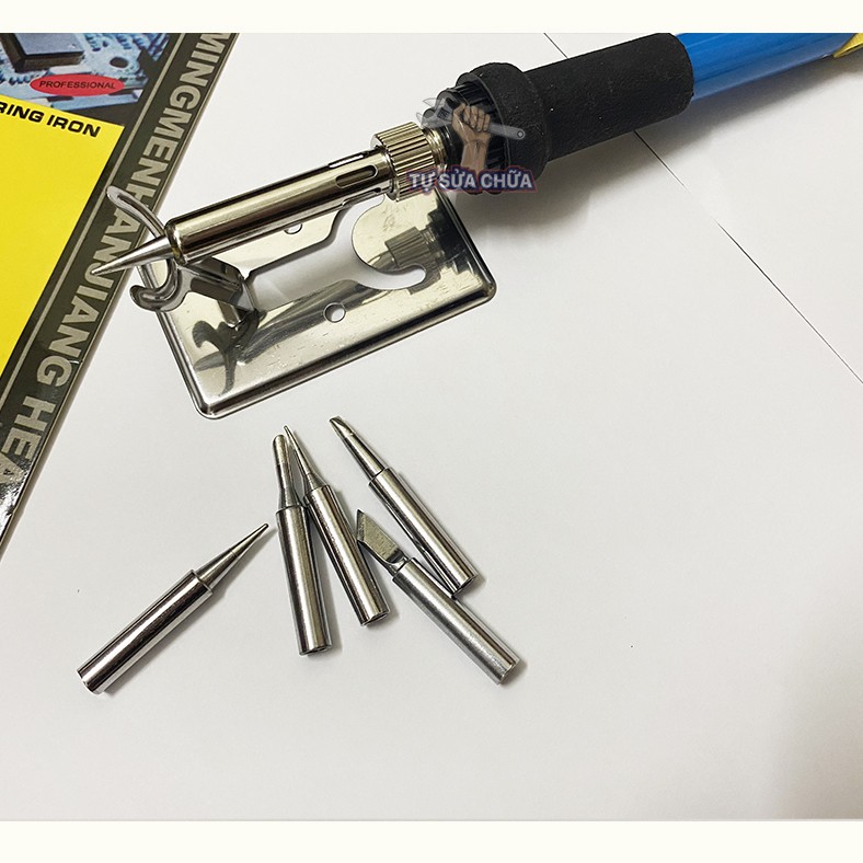 -Một bộ sản phẩm bao gồm: 1 mỏ hàn 60W, 5 mũi mỏ hàn, 1 đế gác mỏ hàn, 1 cuộn thiếc, 1 nhựa thông