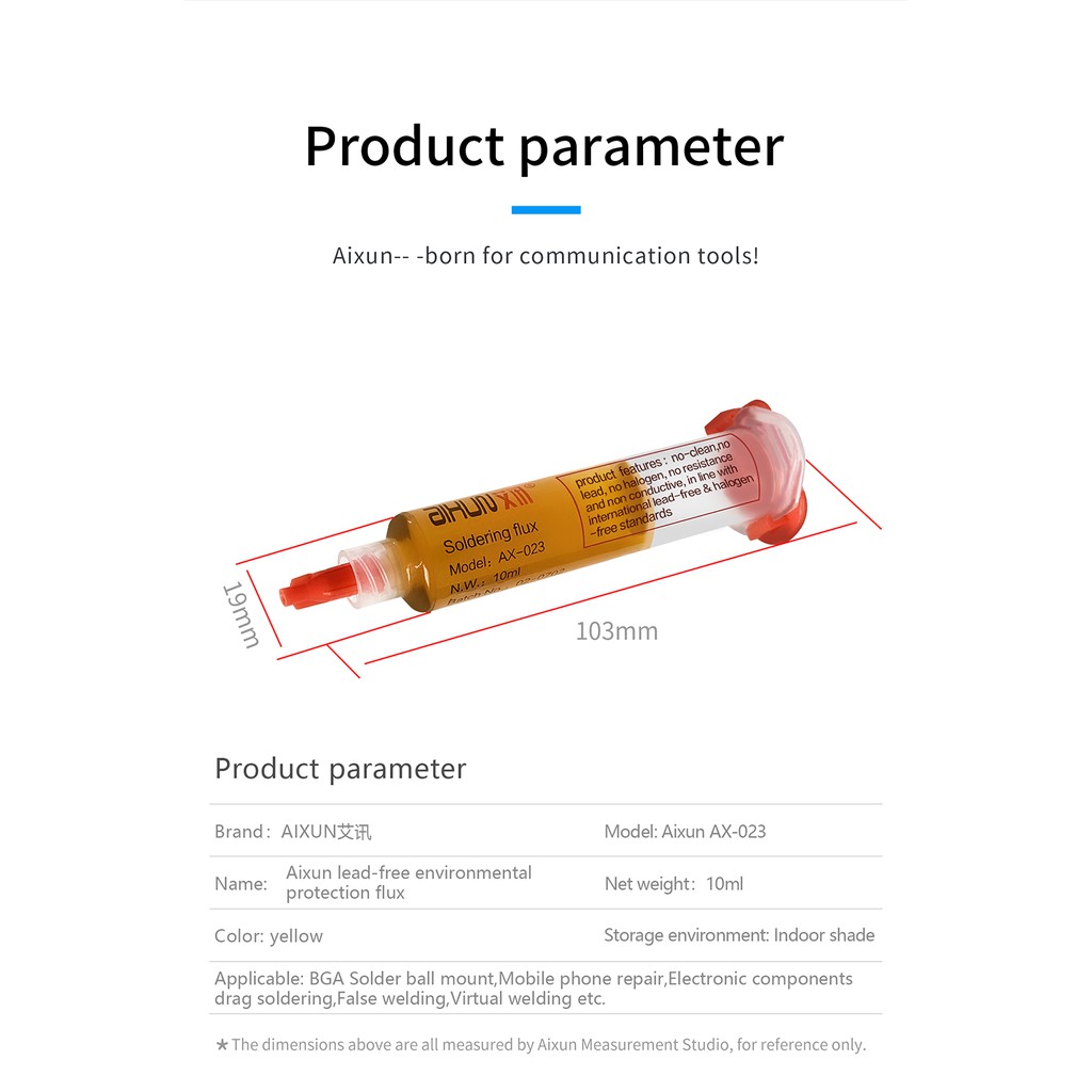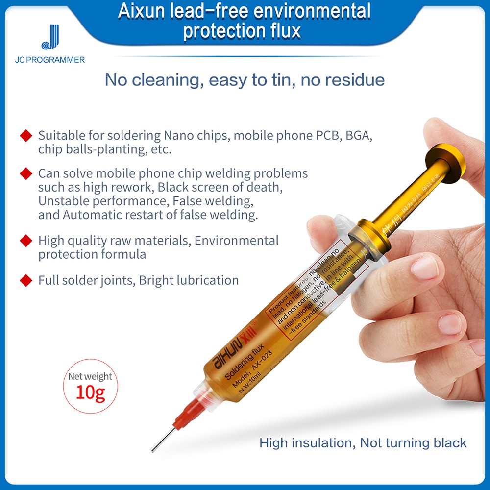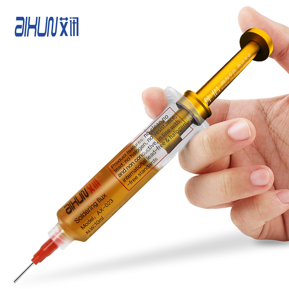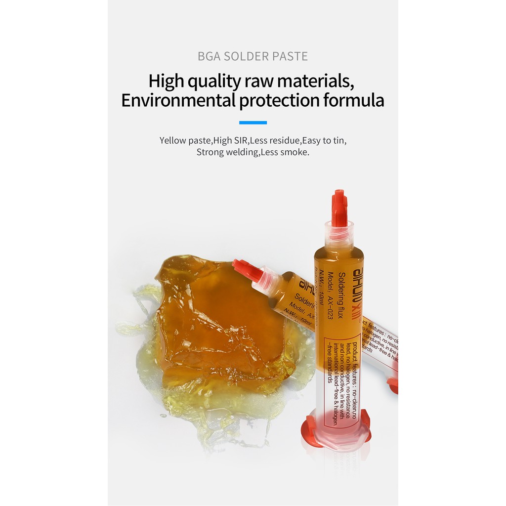 Mỡ hàn nhựa thông AiXun AX023 không chứa halogenĐặc tính No-clean (không cần làm sạch sau quá trình hàn), dễ hàn, ít khói, không có cặn