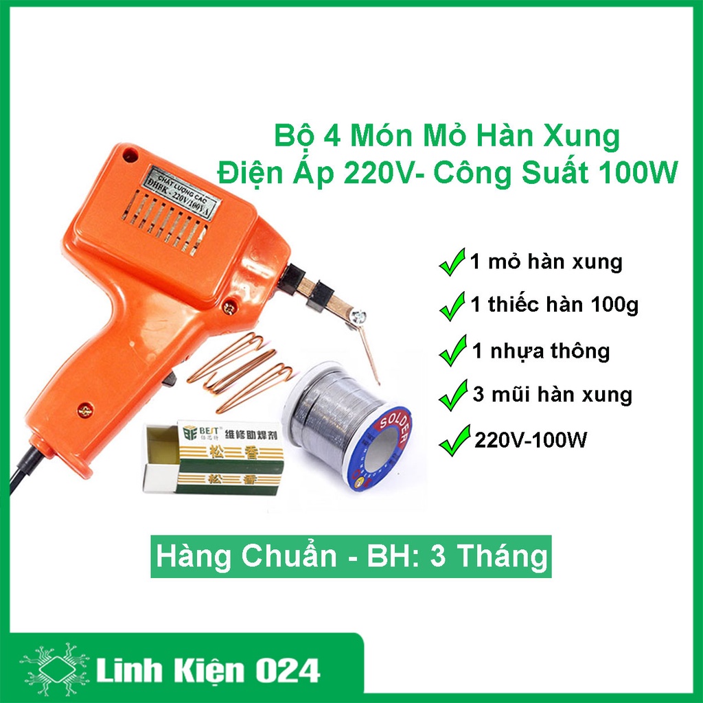 Giới thiệu sản phẩm Mỏ Hàn Xung 220V-100W Chuẩn ( Tặng 01 thiếc OK 100g, 01 hộp nhựa thông, 03 mũi hàn xung )1. Bộ sản phẩm bao gồm: