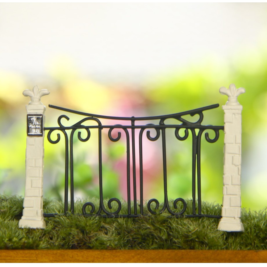 Mô hình cánh cổng sắt hoa với trụ gạch trắng cổ điển và quý phái trang trí tiểu cảnh, nhà búp bê