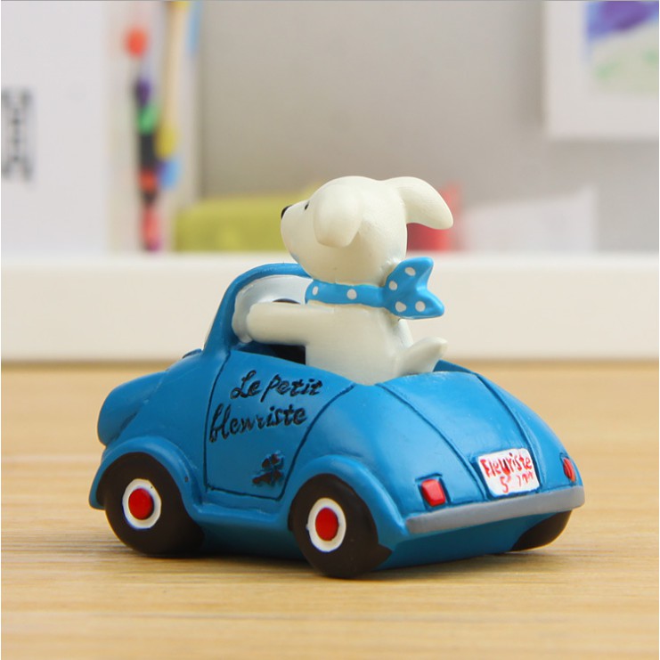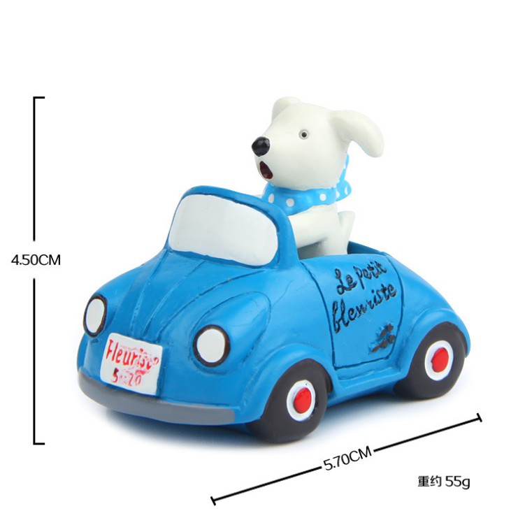 Mô hình chó trắng đi xe màu xanh dùng trang trí tiểu cảnh, bonsai, DIY