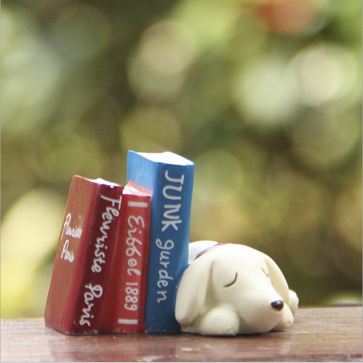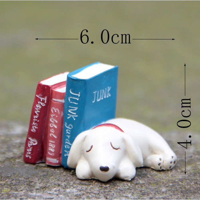 Giới thiệu Mô hình chó trắng nằm ngủ bên chồng sách thích hợp trang trí tiểu cảnh, chụp ngoại cảnh sản phẩm, DIY