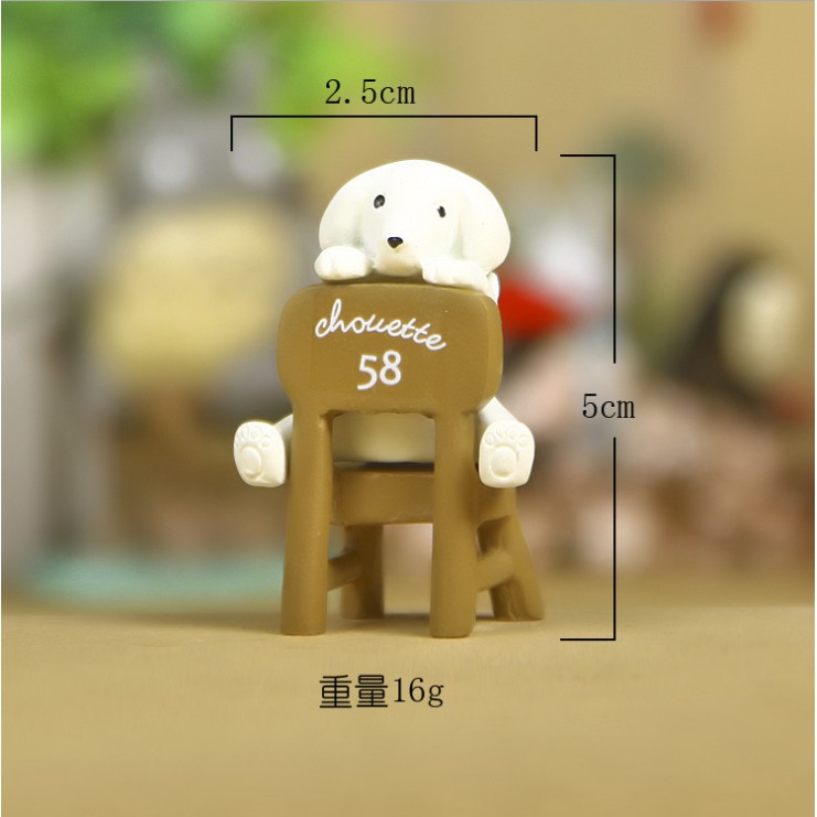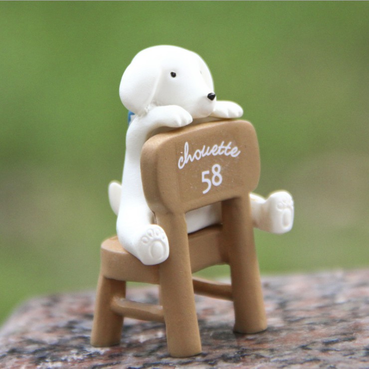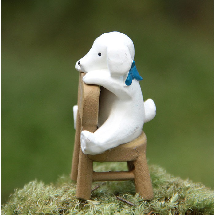 Mô hình chó trắng ngồi ghế gỗ trang trí tiểu cảnh, bonsai, dựng studio chụp ngoại cảnh, DIY