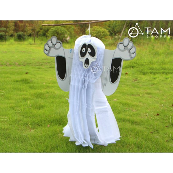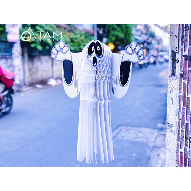 Halloween là lễ hội nổi tiếng với những thứ kinh dị. Mô hình con ma Halloween bằng giấy trắng đen, mặt hốt hoảng kinh hãi. Phần chân là giấy xếp dọc, khi có gió sẽ bay bay đu đưa sống động. Con ma giấy được thiết kế xếp gấp gọn gàng, tiện lợi.CHI TIẾT SẢN PHẨM: