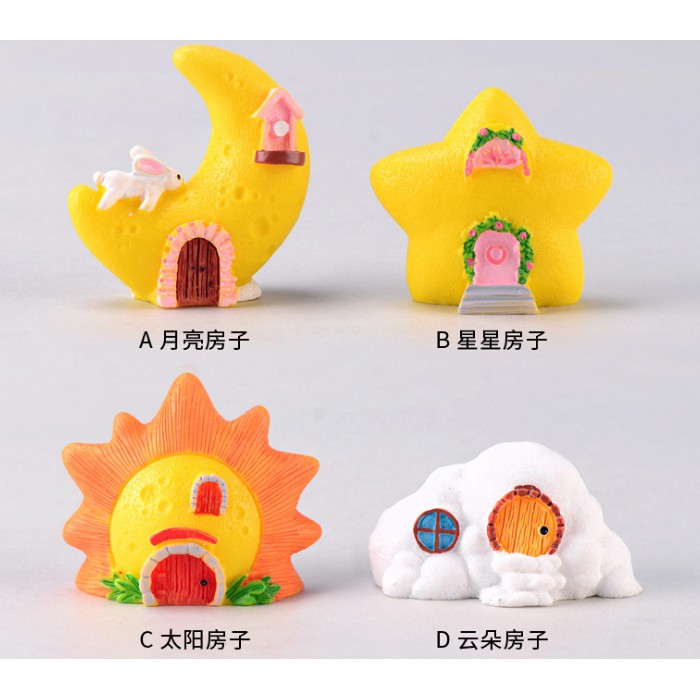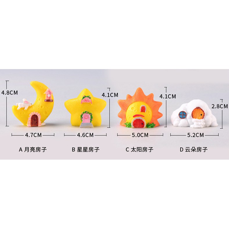 Mô hình các ngôi nhà như truyện cổ tích với tạo hình Đám mây, Mặt Trăng, Mặt Trời, Ngôi sao cho các bạn thử dựng tiểu cảnh, bonsai hoặc làm móc chìa khóa, DIYKích thước cao : xem ảnh chi tiết từng mẫu ở cuối.
