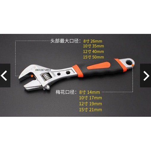 - Mỏ lết có chốt vặn điều chỉnh với hơn 25% lực xoắn để nới rộng hay thu nhỏ